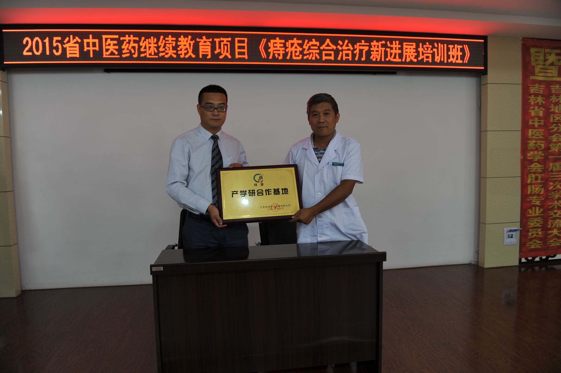 9月12日由吉林省中医药学会主办,吉林省吉林中西医结合医院承办的,2015年吉林省中医药继续教育项目《痔疮综合治疗新进展培训班》,暨吉林省中医药学会吉林地区分会第一届三次学术交流大会,江苏钱璟医疗集团吉林地区产学研基地成立大会,在我院隆重召开。来自吉林地区的肛肠界的专家及同仁们,近150人参加了大会。