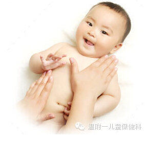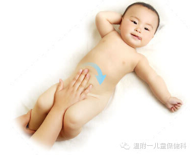 1、放平手掌,顺时针方向画圆抚摩宝宝的腹部。注意动作要特别轻柔,不能离肚脐太近。