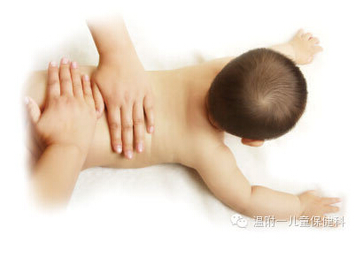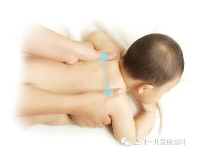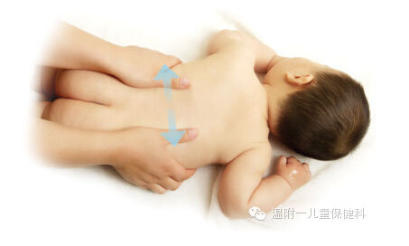 1、双手大拇指平放在宝宝脊椎两侧,其他手指并在一起扶住宝宝身体,拇指指腹分别由中央向两侧轻轻抚摸,从肩部处移至尾椎,反复3-4次。