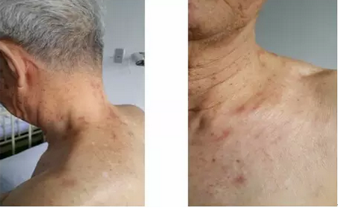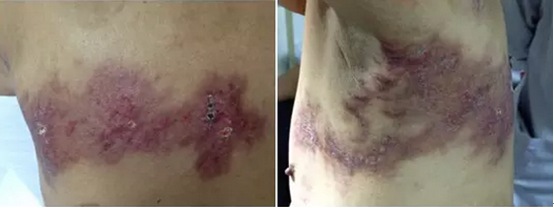 ▲图1:带状疱疹,皮疹位于胸背部沿肋间神经分布