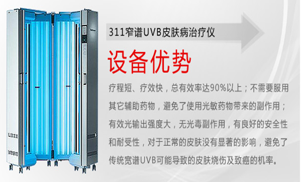 我院分别引进了德国产全身及局部的窄谱紫外线治疗仪,采用波长为311-313nm的窄谱中波紫外线(NB-UVB)为皮肤病患者做照射治疗,简称光疗。该波长紫外线具有免疫抑制作用,可使移行及增殖的黑素细胞免受破坏,为某些顽固的慢性皮肤病提供了新型有效的治疗途径。