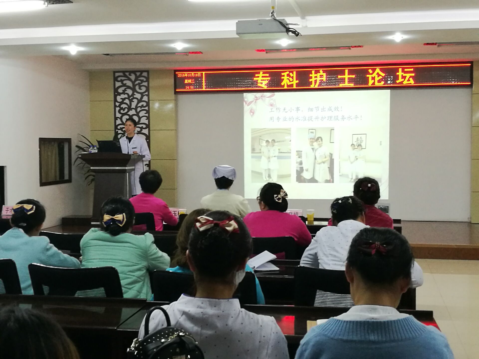 10月18日、19日下午,由护理部承办的护理论坛之专科护士论坛在我院多功能厅顺利召开,论坛执行主席刘玉梅护士长担任大会主持人。会上,2015年至2016年期间我院参加进修学习归来的护理人员对她们的学习心得进行了精彩汇报。