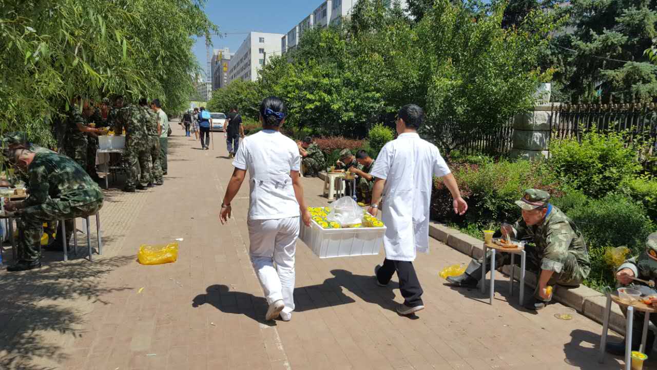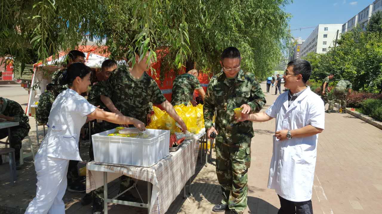 洪水退去,灾后的清淤重建工作任务艰巨,消防官兵们克服高温、连续作战的疲劳等困难,加班加点,很多人已经出现了明显的中暑、体力不支等现象。人民子弟为人民,作为人民的医务工作者更有责任和义务保证子弟兵的身体健康。吉林省吉林中西医结合医院在结束了灾区的医疗援助工作后,仍然坚持每天派医护人员驻扎在消防官兵在灾区的驻地,为受伤的受灾群众和官兵们治疗,而且还每天向驻地送去千余份精心熬制的绿豆汤,希望能为消防官兵、为受灾群众、为灾后重建工作尽一点绵薄之力。