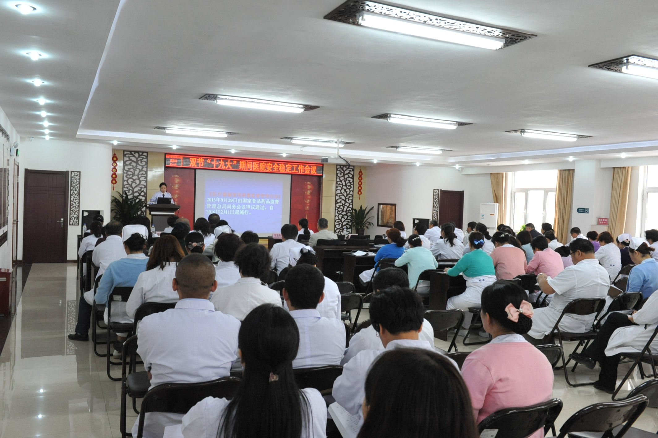 为深入贯彻落实省、市卫生计生委安全维稳工作部署会议精神,全面部署我院安全维稳工作任务,压实责任,切实维护我院安全稳定的工作态势,为党的十九大胜利召开营造安全稳定的社会环境。医院于9月28日下午召开了全院双节“十九大”期间安全稳定工作会议,院领导班子、各科室负责人、相关责任人等近200人参加会议。