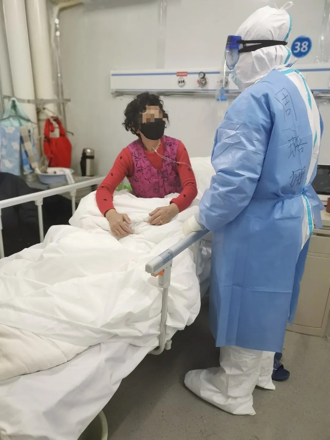 住进病区后,我作为潘阿姨的一对一责任护士承担起了照顾她的工作。潘阿姨没读过书,也不识字,再加上一口地道的湖北方言,几次沟通下来,我是手也用上了,脚也用上了,虽然效果还行,但是对于穿着防护服动一下一身汗的我们来说实在是有些费劲。怎么才能让沟通顺利一点呢,我转念一想,潘阿姨有儿子啊,年龄跟我相仿,正好可以充当我们的“远程翻译”。