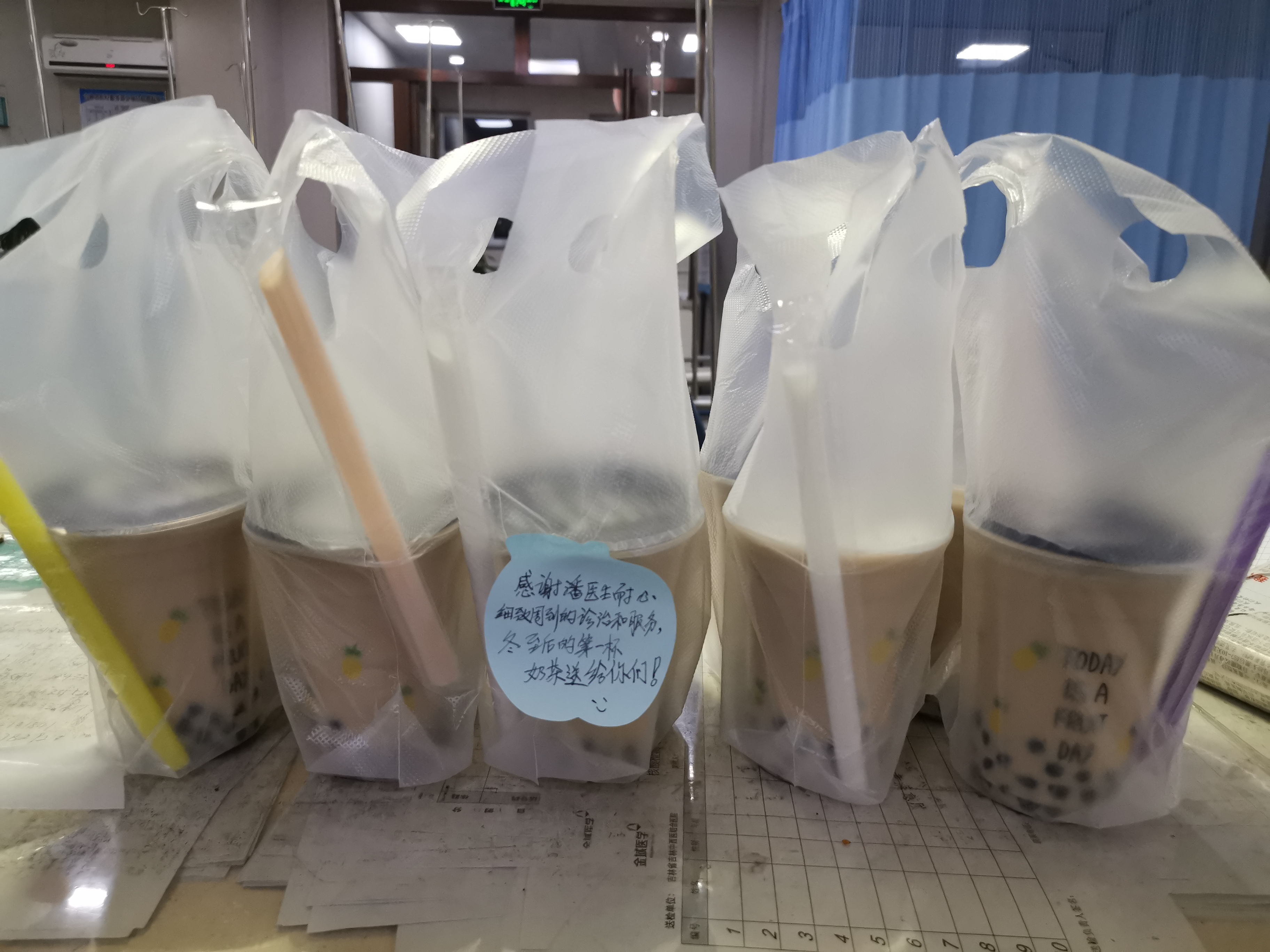 12月27日晚上是潘金龙医生的夜班,正常交接班以后就开始了繁忙的抢救工作,参与会诊、救治急诊患者,整个急诊科的所有值班人员都在马不停蹄的忙碌着。凌晨两点,抢救工作终于告一段落,回到工作站的潘医生发现桌子上放着五杯奶茶,上面还有一张字条。