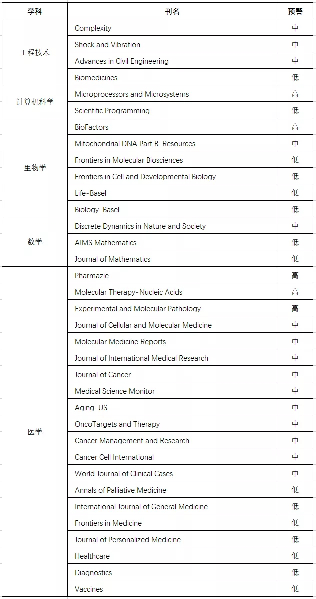 预警期刊分为高、中、低三个等级,各等级关注问题侧重不一,预警风险依次减弱。高风险预警旨在抑制学术不端问题:批量论文涉及“论文工厂”;中风险预警旨在促进我国学术成果的国际传播和优化我国科研经费的使用:期刊作者群和读者群的国际化程度低,以及论文处理费不合理;低风险预警旨在提醒科学家,期刊存在学术影响力骤降风险:大体量期刊发文量激增。《国际期刊预警名单》确定的原则是客观、审慎、开放。期刊分区表团队希望与科学共同体、科研管理部门、期刊及出版商等共同努力,夯实科学精神,打造气正风清的学术环境。